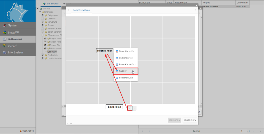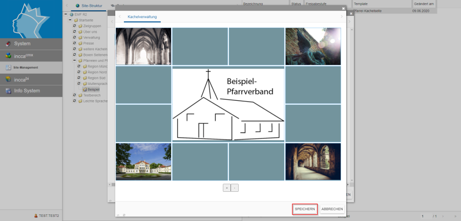 In diesem Schritt befüllen Sie die Kachelseite mit Inhalten. In diesem Tutorial wird eine Pfarrverbands-Kachelseite mit vier Pfarrkirchen erstellt. Die Kirchen werden sternförmig um das Pfarrverbands-Logo angeordnet. Hierfür wird eine 2x2 Kachel in der Mitte und jeweils eine 1x1 Kachel an den Ecken benötigt.
