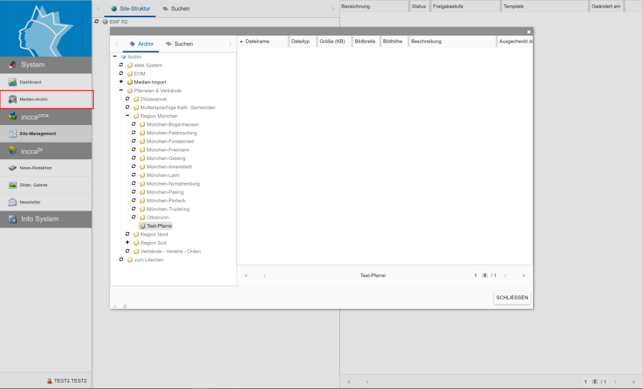 Das "Medien-Archiv" findet man ähnlich wie das "Site-Management" in der linken Menüleiste des incca-CMS Systems.
