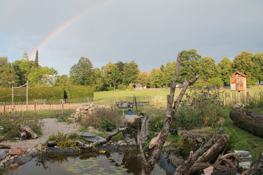 Begonnen wurde mit einem kleinen Teich, da Insekten dringend Wasser benötigen. Rundherum entstand in Form von Sonnenstrahlen, die sich in alle Richtungen ausbreiten, der Insektengarten, der sich in verschiedene Themengebiete aufgliedert: Ein Feld bietet mit Sommerflieder, Brennnesseln und Mohn die Lieblingsnahrung der Schmetterlinge. Im zweiten Feld wachsen Disteln, Königskerzen und Nachtkerzen für Nachtfalter. Daneben gibt es Nahrung für die Bienen mit Phacelia, Buchweizen, Klatschmohn und verschiedenen Lippenblütlern. Ein viertes Feld ist die Magerwiese mit Thymian, Sterndolde, Hauswurz, Enzian und Kuckucksnelken.