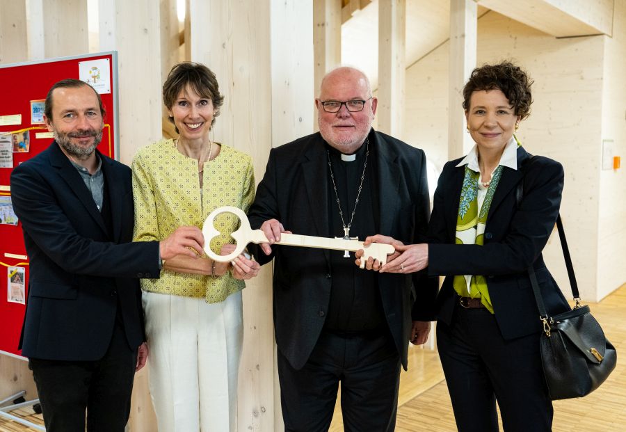 (v.l.) Architekt Mirek Tobor, Schulleiterin Dunja Schoerrig, Kardinal Reinhard Marx und Ressortleiterin Sandra Krump mit dem symbolischen Schlüssel