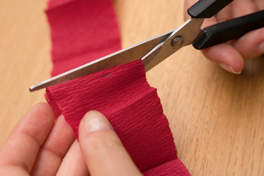 1. Es wird ein ca. 5 cm breiter und 60 cm langer Streifen vom Krepppapier abgeschnitten.