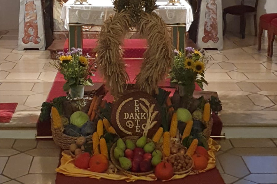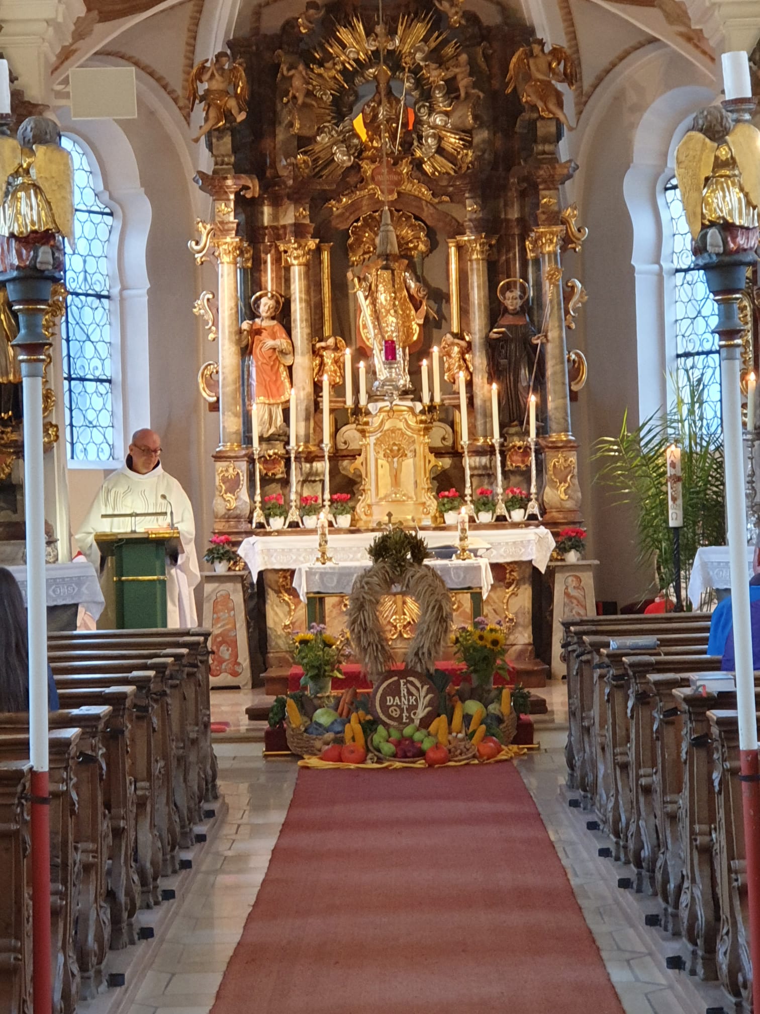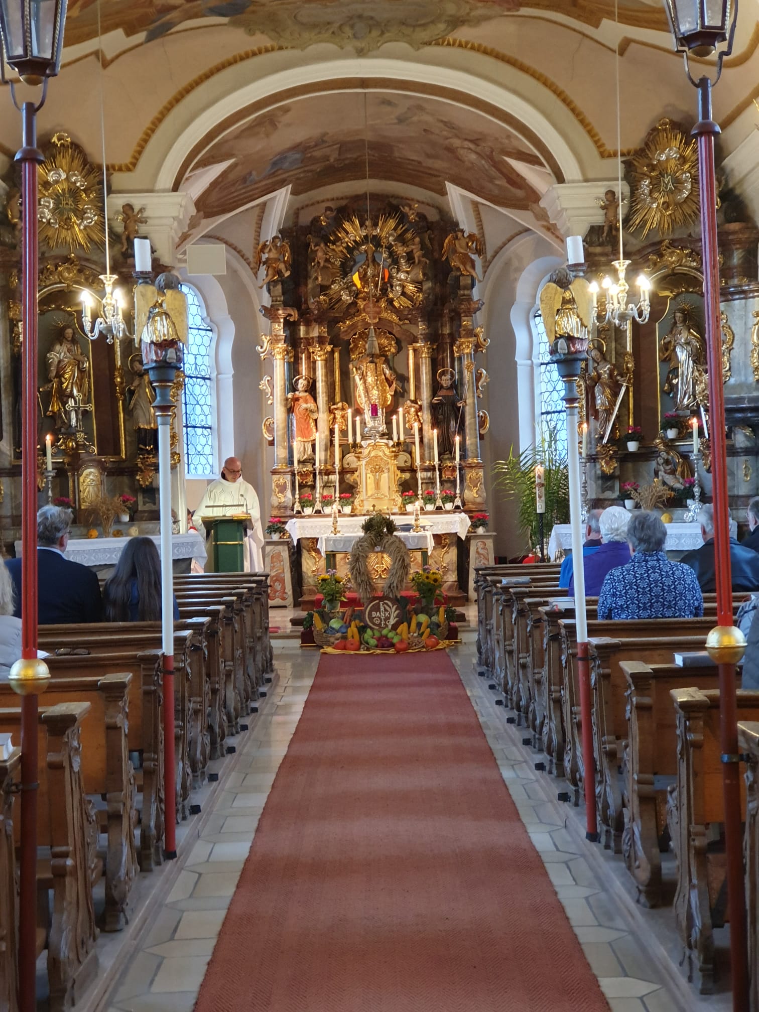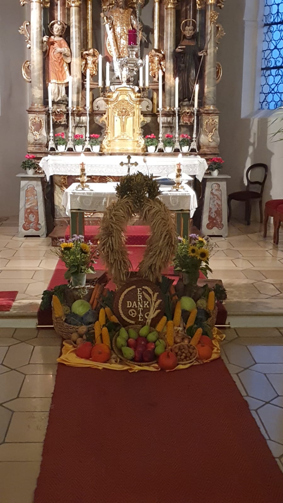 Vor dem schön gestalteten Erndedankaltar wurde die Hl. Messe feierlich von Pater Lazarus zelebriert. Musikalisch umrahmten die Valentins die Messe, die gut besucht war.