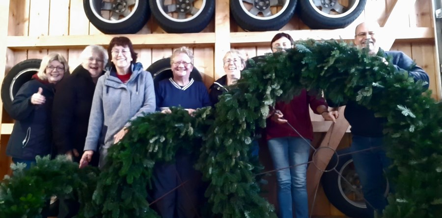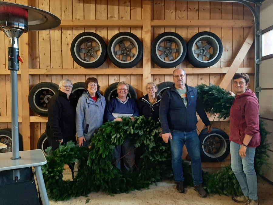 Auch in diesem Jahr trafen sich am letzten Dienstag sieben engagierte Pfarrgemeinderätinnen und ein Pfarrgemeinderat auf dem Betrieb von Resi Selmair in Norlaching in der wohltemperierten Scheune, um die Adventskränze für Pfarrkirche, Marktkirche und Pfarrheim zu binden.