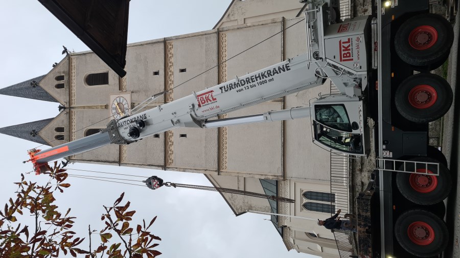 Mithilfe eines 60 t-Krans der Firma BKL wurden die beiden Dachdecker in die Höhe gehievt,