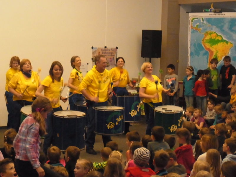 Nach einem Tanz der Klasse 4a kam es zu dem nicht zu bestreitenden Höhepunkt: Via Jante, eine zehnköpfige brasilianische Trommlergruppe gab ihr bestes. Da gab es kein Halten mehr, da wurde mitgeklatscht, rhythmisch auf dem Boden gestampft, ob Kinder oder Lehrkräfte, keiner konnte sich den Bewegungen entziehen. Immer wieder wurde eine Zugabe gefordert, ein lautes Rufen und Schreien, das letztendlich doch unterging in den donnernden Rhythmen der Gruppe.