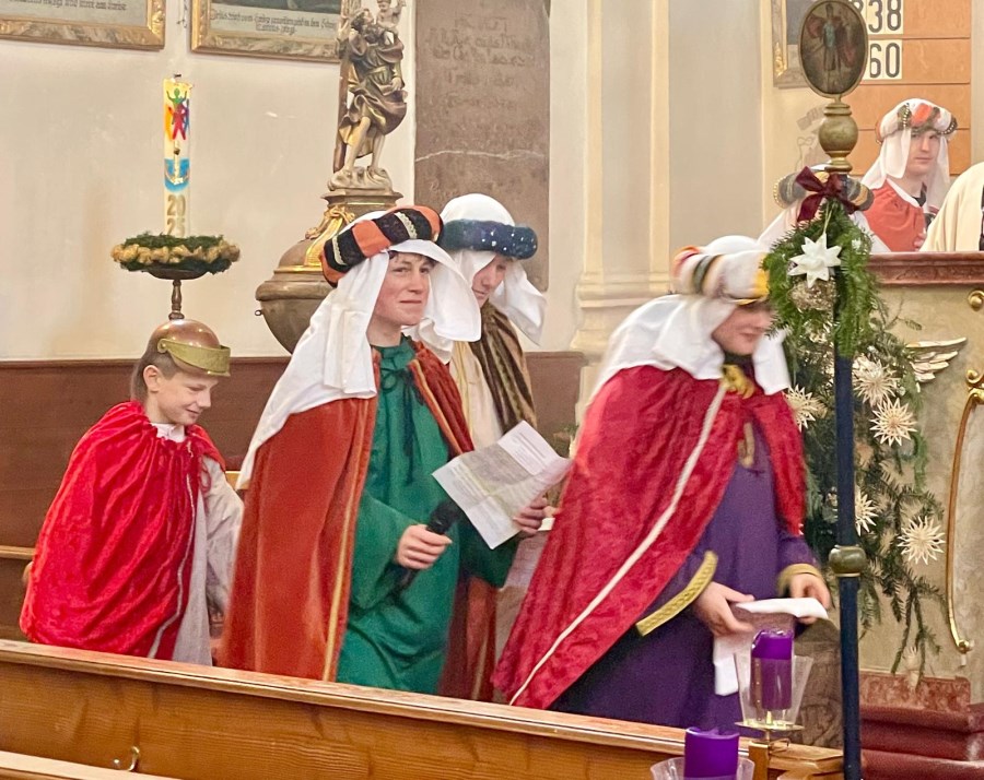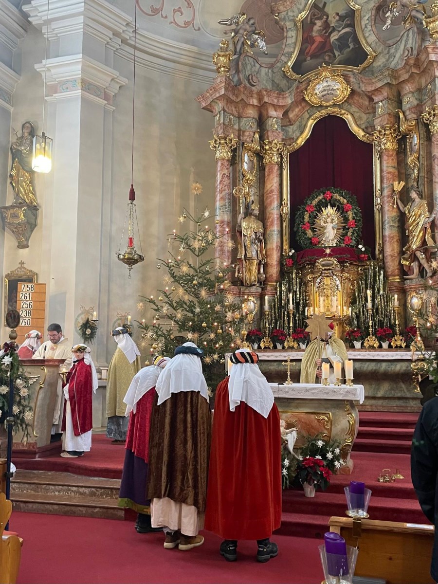Pfarrer Weinzierl mit den Weißbacher Königen beim Aussendungsgottesdienst