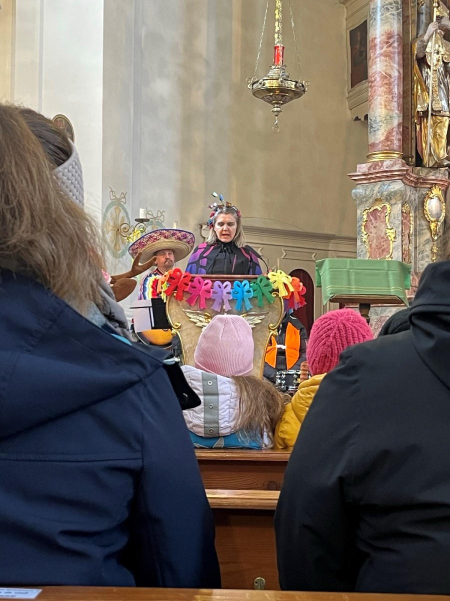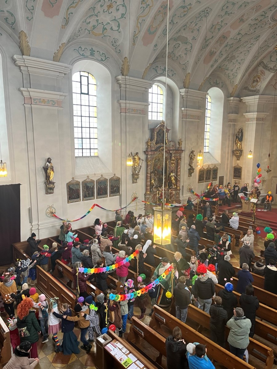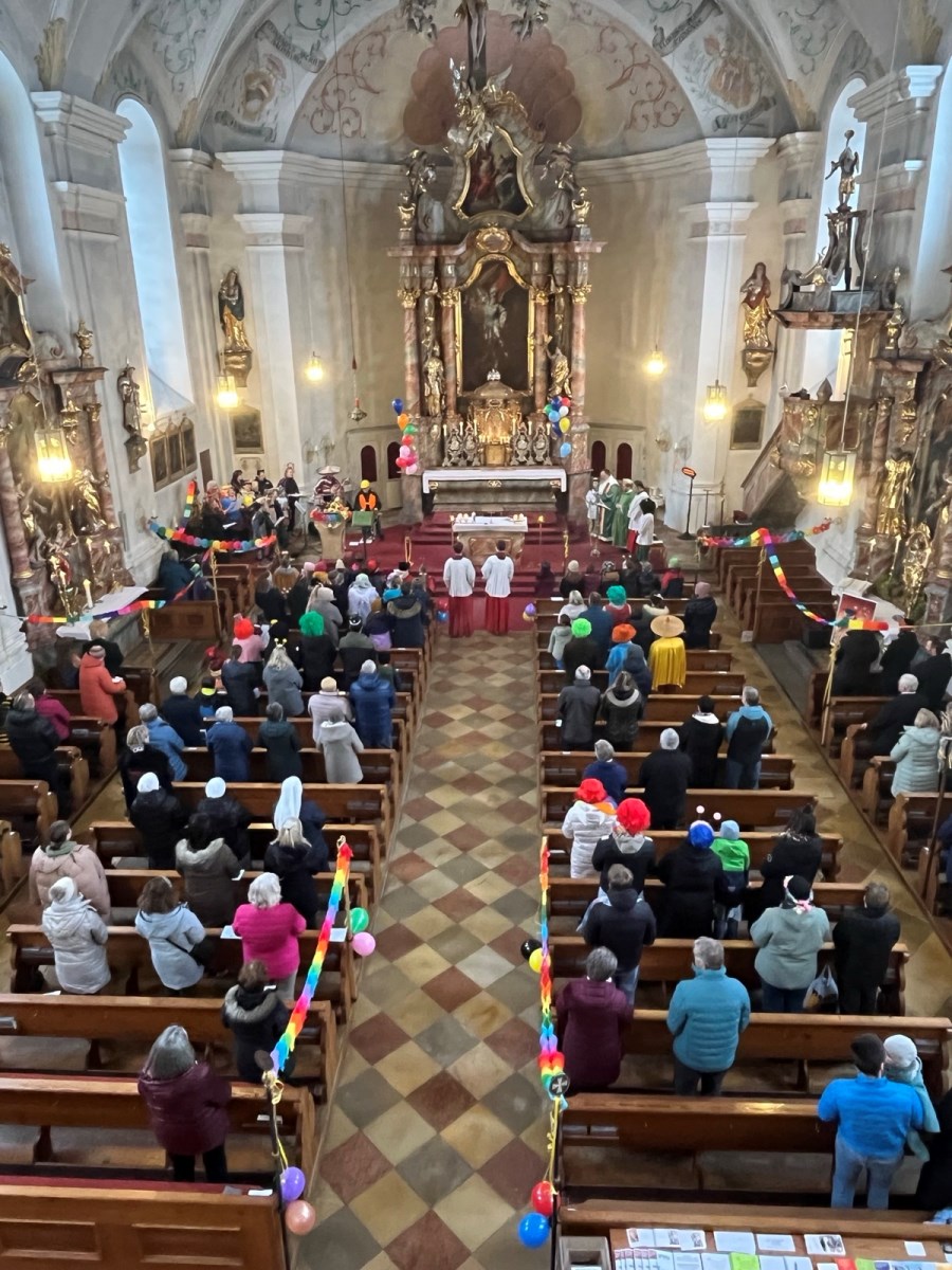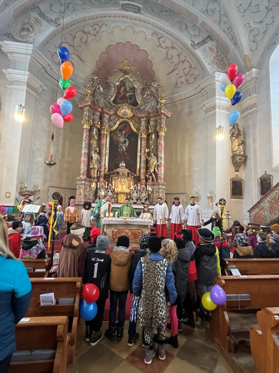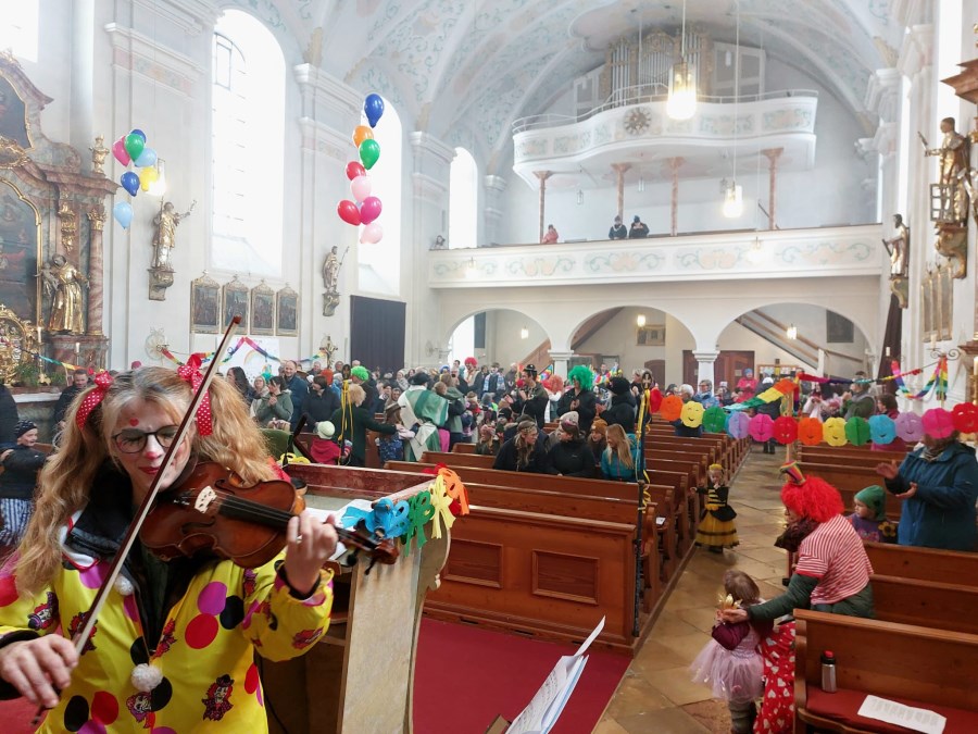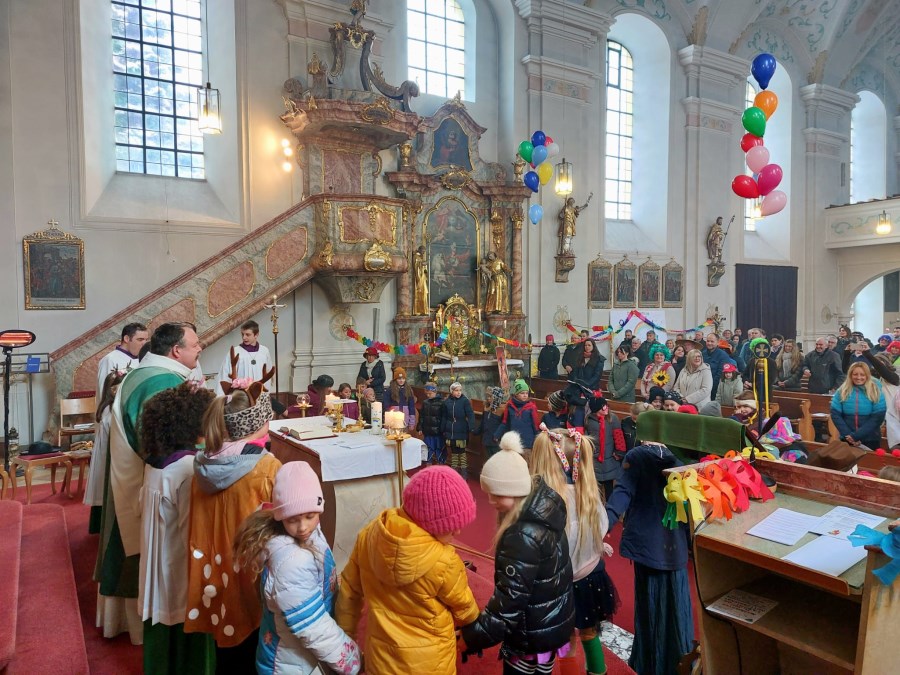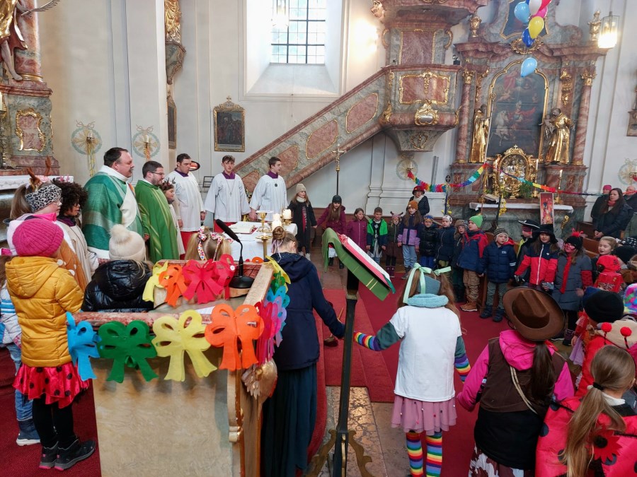 Bunt geschmückt und voller Leben präsentierte sich die Pfarrkirche beim diesjährigen Faschingsgottesdienst. Luftschlangen, Luftballons und farbenfrohe Dekoration und viele verkleidete Kinder sorgten schon beim Betreten der Kirche für eine heitere Atmosphäre.