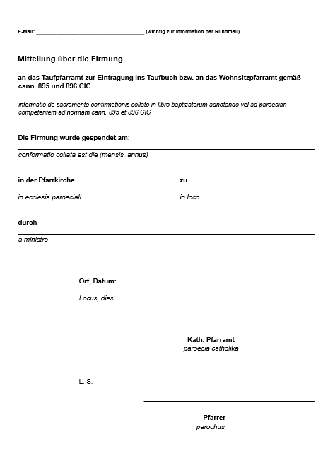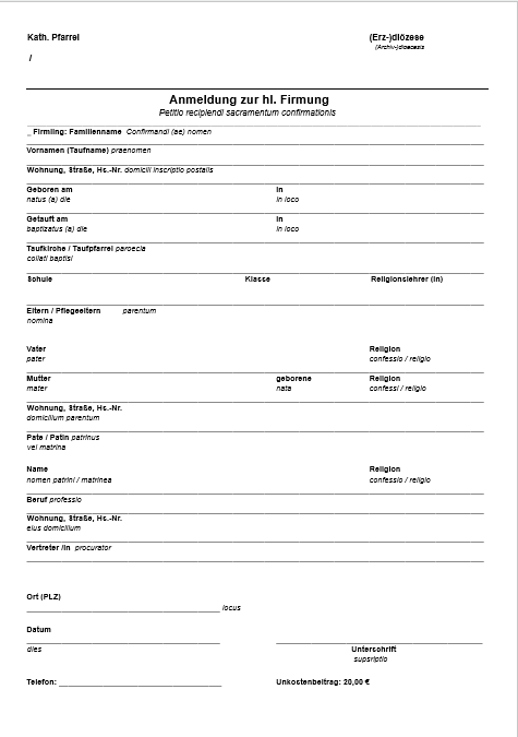 Zur Anmeldung benötigen wir die Vorlage des Taufscheins bzw. die Eintragung im Familienstammbuch. Außerdem ist die Benennung eines Paten/Patin wichtig. Das Patenamt kann ausüben, wer der katholischen Kirche angehört, mindestens 16 Jahre alt ist und bereits gefirmt ist. Von Paten die nicht in unserem Pfarrverband wohnen benötigen wir einen Taufschein. Diesen bekommt man beim Taufpfarramt.
