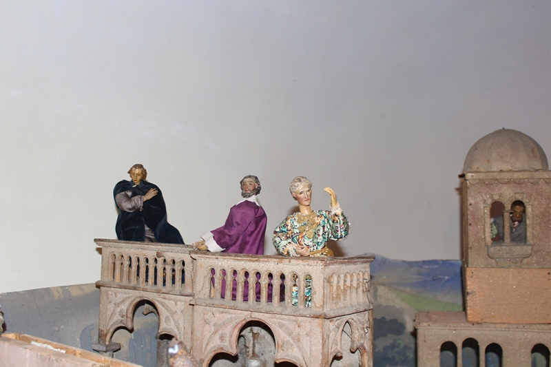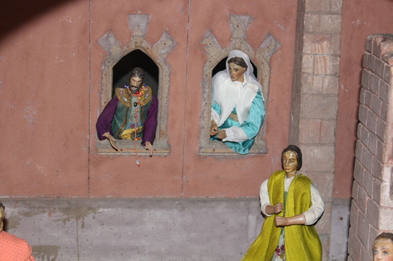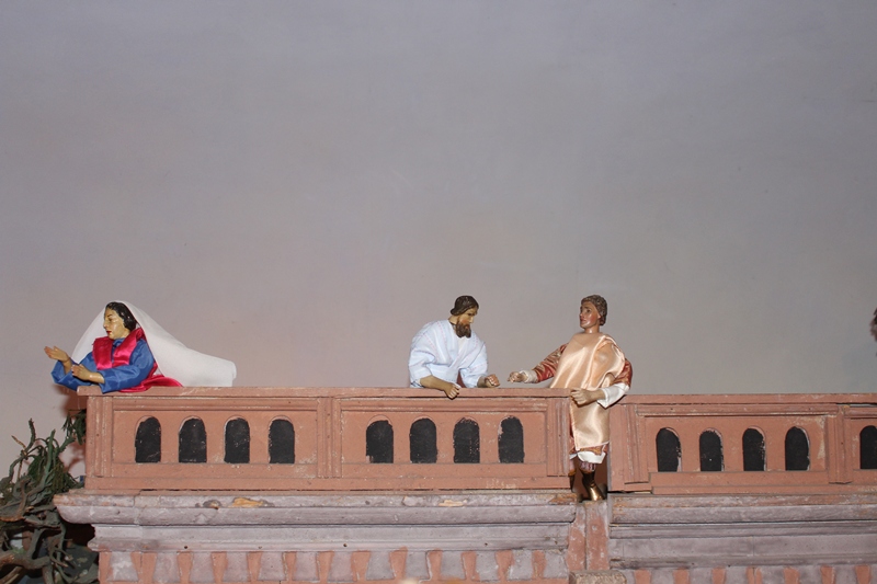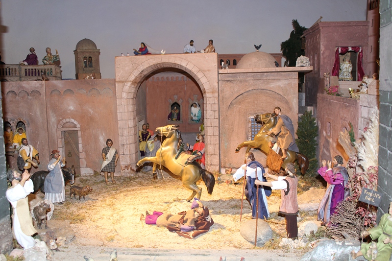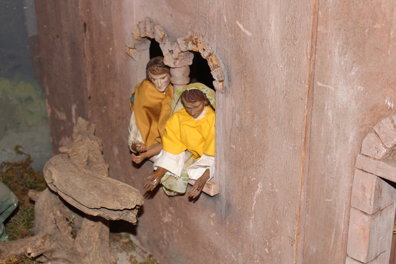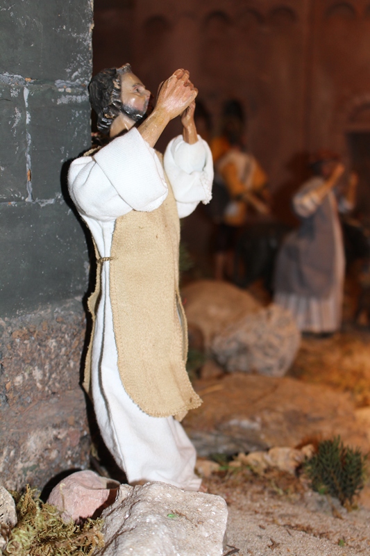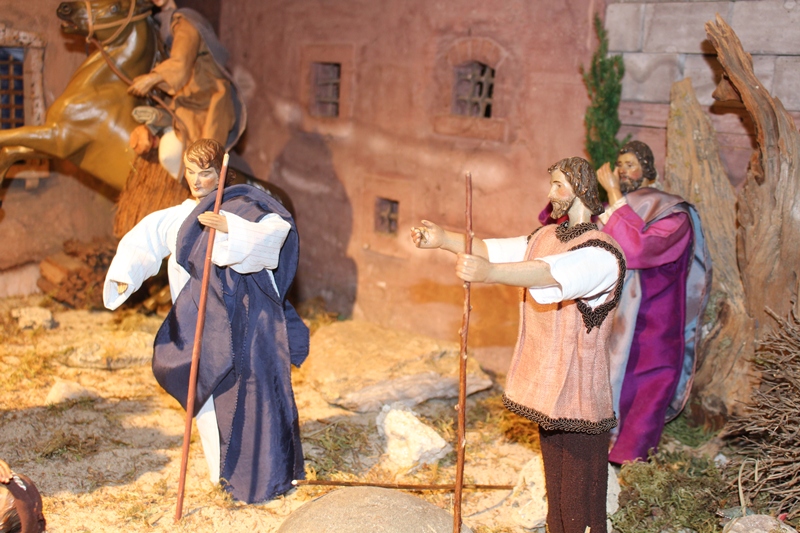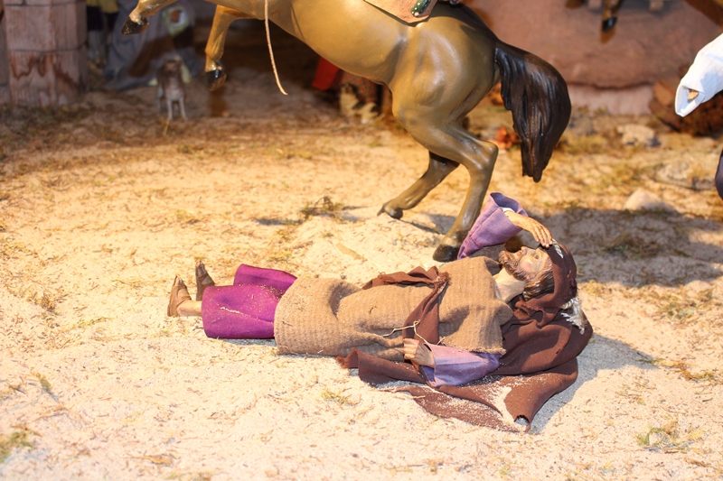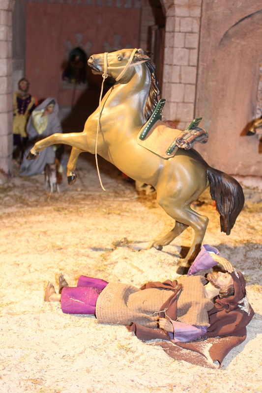 In der Apostelgeschichte wird nur von einem hellen Licht berichtet. Oft wird die Bekehrung des Saulus aber mit einem Sturz von einem Pferd dargestellt. Daher haben auch wir in der Krippendarstellung zwei wunderschöne Pferde mithineingenommen. Der eine Begleiter des Saulus kann sich gerade noch halten, als die Pferde, die durch das helle Licht erschrocken sind, wild werden. Saulus ist heruntergefallen und versucht seine Augen vor dem gleißenden Licht zu schützen.