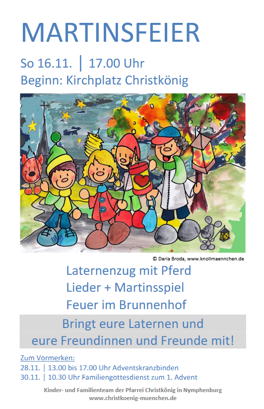 Für alle, die gerne beim Martinsspiel mitmachen möchten, gibt es eine Probe am Sa 15.11. um 09.30 Uhr in der Kirche. Einfach vorbeikommen oder vorher im Pfarrbüro bescheid geben.