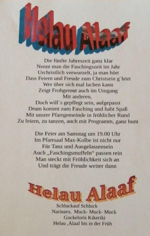Ob jung oder alt, faschingsbegeistert oder nicht - alle sind herzlich willkommen. Lassen Sie sich von der gereimten Einladung von Edeltraud Lankes locken!