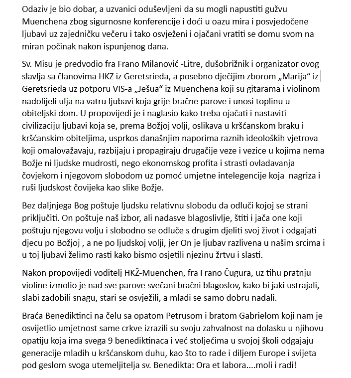 - U utorak 24.2.2026. i u srijedu 25.2.2026. održat će se s početkom u 19.30 zaručnički tečaj u kapeli bl. Al. Stepinca (Schwanthalerstr. 96, 80336 München).