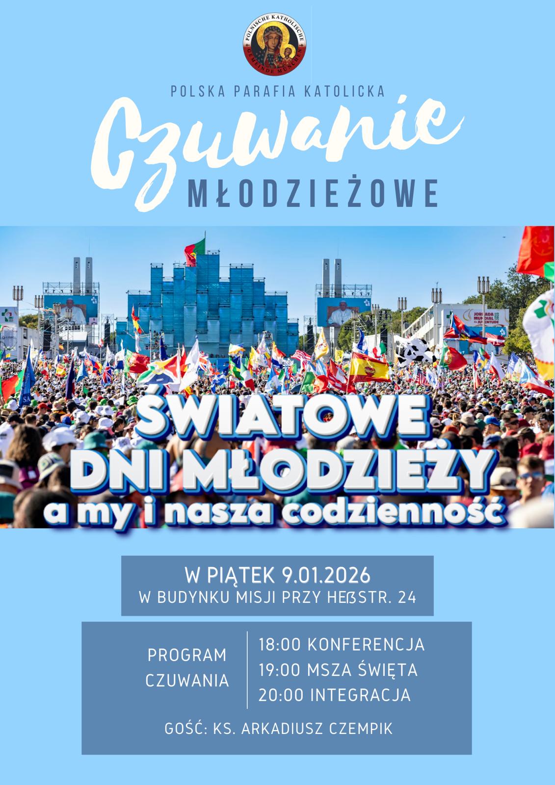 Serdecznie zapraszamy młodzież naszej parafii (od 14 lat) na pierwsze w tym roku spotkanie młodzieżowe, na którym będziemy gościć ks. Arkadiusza Czempika – duszpasterza ds. młodzieży diecezji Monachium-Fryzynga. Spotkanie odbędzie się 9.01 o godzinie 18.00 w budynku misji (Heßstr. 24).