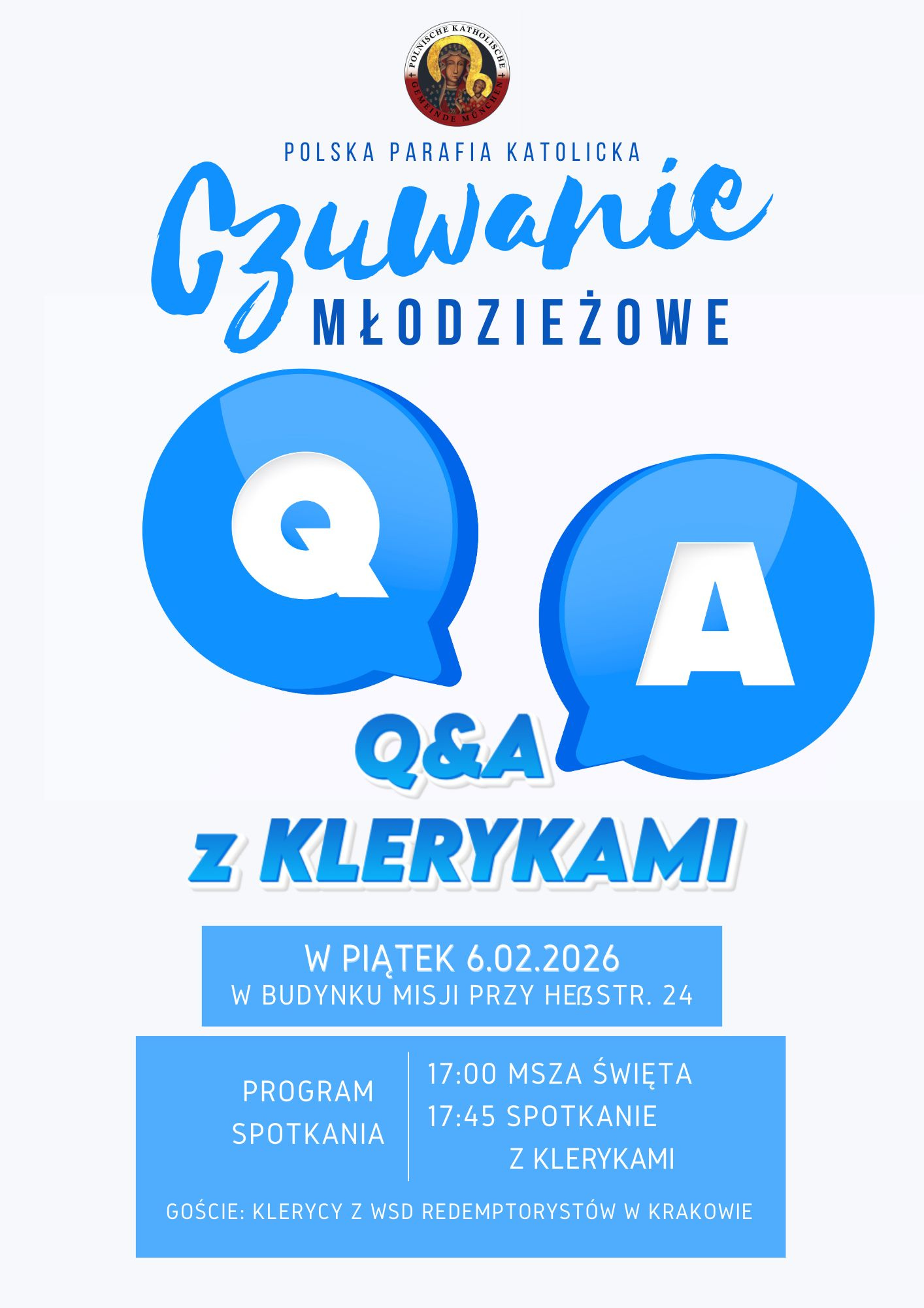 Serdecznie zapraszamy młodzież naszej parafii (od 14 lat) na kolejne w tym roku spotkanie młodzieżowe, na którym będziemy gościć kleryków z Wyższego Seminarium Redemptorystów w Krakowie. Spotkanie odbędzie się 6.02 o godzinie 17.00 w budynku misji (Heßstr. 24). Rozpoczynamy Mszą Świętą!