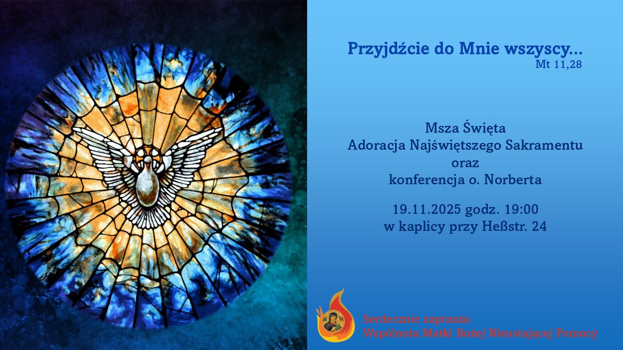 Serdecznie zapraszamy w środę, 19 listopada o godzinie 19.00, na kolejne spotkanie adoracyjne połączone z konferencją przygotowującą nas do Uroczystości Zesłania Ducha Świętego.