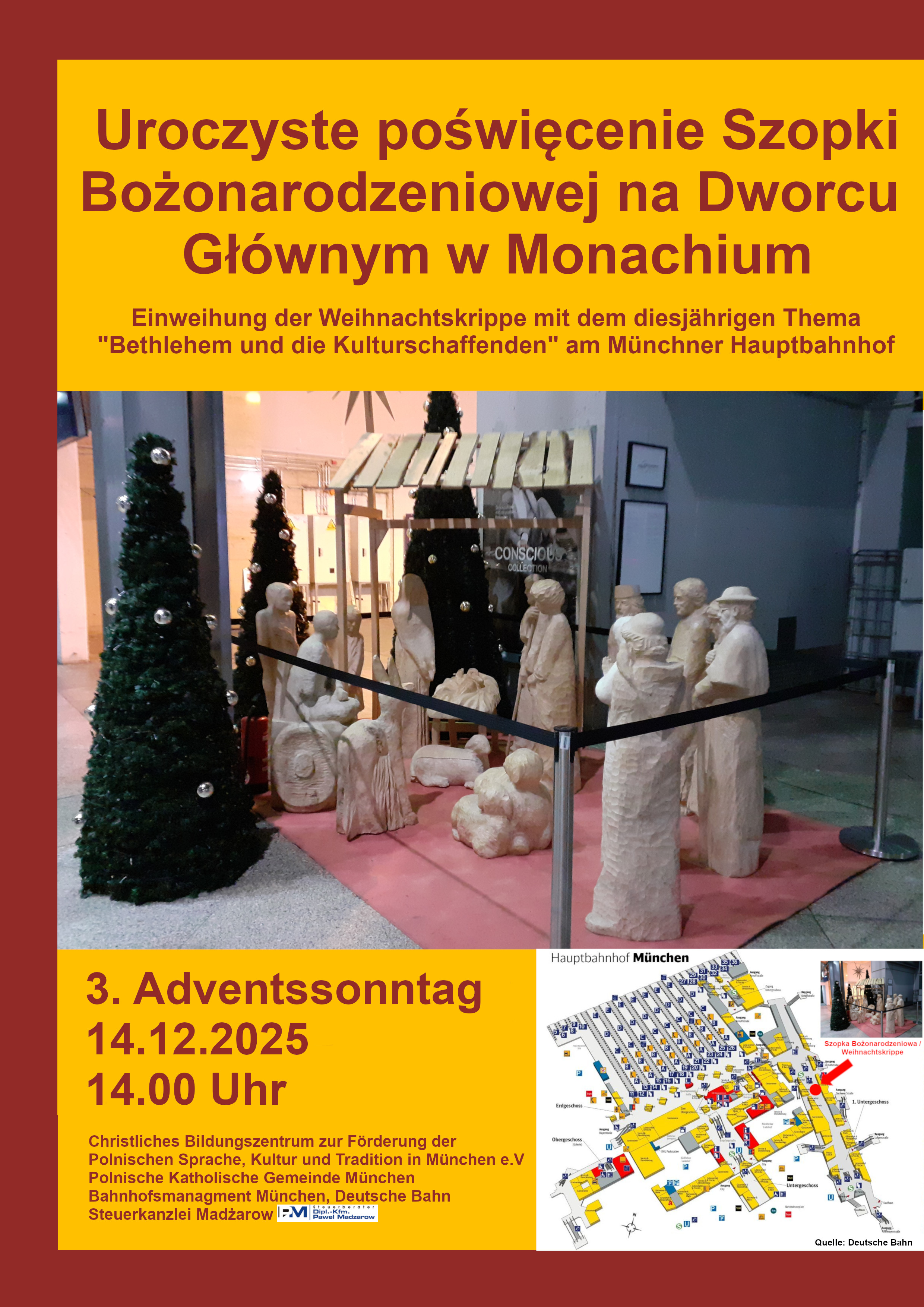 Serdecznie zapraszamy na uroczyste otwarcie polskiej Szopki Bożonarodzeniowej na dworcu głównym w Monachium, którą w niedzielę, 14 grudnia 2025 r. o godz. 14.00 pobłogosławi o. proboszcz dr. Stanisław Pławecki CSsR.