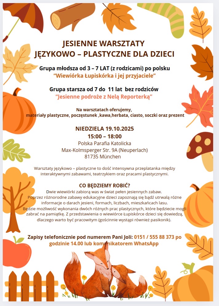 Serdecznie zapraszamy na czwartą edycję jesiennych warsztatów językowo-plastycznych dla dzieci, które odbędą się w niedzielę (19.10) od godz. 15.00 do 18.00 (Max-Kolmsperger Str. 9A).