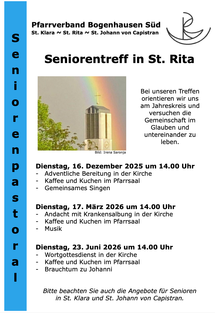 Der Seniorenkreis "Treffpunkt Capistran" trifft sich in der Regel einmal im Monat, donnerstags um 15 Uhr im Pfarrheim.