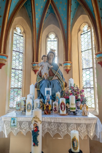 Kirche St. Laurentius, 1740, barocker Rosenkranzaltar, aus Kloster Altenhohenau stammend.