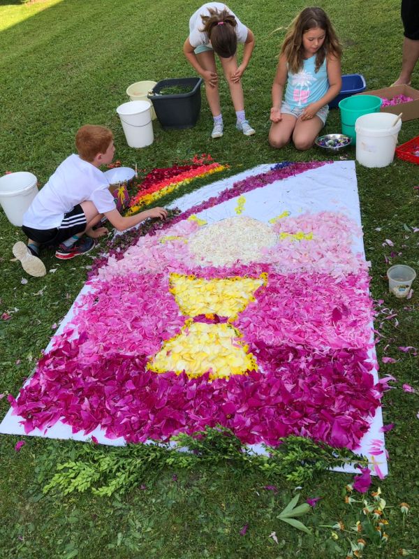 Heuer gab es Buntes zu bestaunen: Für den Altar beim Maibaum gestalteten Erstkommunionkinder unter Anleitung und Hilfe von Carola, Rosaria und Adriana Vassallo in liebevoller Kleinarbeit einen großen, bunten Blumeteppich - sehr zur Freude aller Prozessionsteilnehmer.