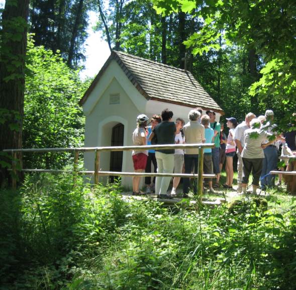 Von Kirchstett ging die Fahrt auf schattigen Forststraßen weiter zur Hubertuskapelle, am Waldrand bei Aschberg, hoch über Isen. Monika Strobl und Elfriede und Georg Liebl erwarteten dort die Besucher.