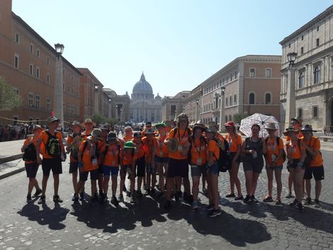 ...als wir Sonntagmittag in Rom ankamen ging es für uns erst einmal zum Mittagessen. Den Rest des Tages verbrachten wir damit, Rom kennenzulernen und abends mit 1000 anderen Minis den Anfangsgottesdienst zu feiern. Am Montag besuchten wir einen der wichtigsten Punkte in Rom, den Vatikan. Die lange Wartezeit vor dem Petersdom war schnell vergessen als wir im Petersdom standen. Er beeindruckte uns mit seiner Größe und der prunkvollen Ausstattung. Ein weiterer interessanter Punkt waren die Papstgräber, die im und unter dem Dom zu finden waren. Um einen noch schöneren Blick über den Petersdom und Rom zu haben ging ein Teil unserer Gruppe hinauf in die Kuppel des Doms und genoss einen wunderschönen Ausblick.