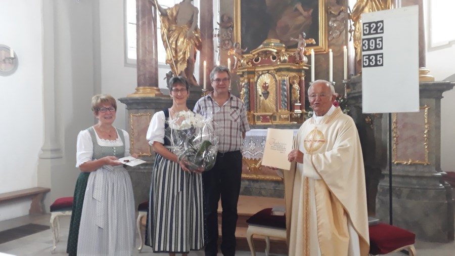 v.l.: Thomas Pongratz (25 Jahre Lektor), Margarete Sunde (40 Jahre Lektorin und 25 Jahre Kommunionhelferin), Pfarrvikar Andreas Kolb, Markus Zerluth (40 Jahre Lektor)
