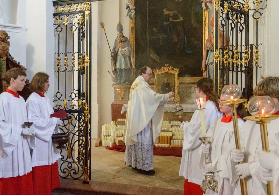 Zu Mariä Lichtmess wird traditionell der Jahresbedarf an Kerzen für die Kirchen geweiht. Auch die Gläubigen bringen an diesem Tag ihre Kerzen für den häuslichen Gebrauch zur Segnung mit. Diese gesegneten Kerzen sollen vor allem Unheil abwehren. Das glaubte man früher und tut es teilweise auch heute noch. Das Bild zeigt Dekan Klaus Vogl beim Weihen der bereitgelegten Kerzen.