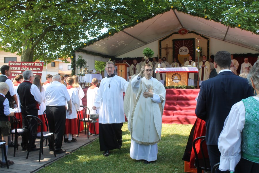 Zu Beginn der Primizfeier sagte Pfarrer Majchar vor den vielen Gottesdienstbesuchern, die den Schulhof füllten: „Pater Placidus ist Euer ganzer Stolz.” Er begrüßte die Vertreter der Geistlichkeit und die weltlichen Vertreter, darunter Landrat Bernhard Kern und Bürgermeister Andreas Buchwinkler. „Im Mittelpunkt unserer heutigen Eucharistiefeier steht Jesus Christus”, so Majchar. Pater Placidus ergänzte: „Gott ist unser Mittelpunkt. Er ist der Bauherr unseres Lebens.” Er segnete Wasser und Salz und besprengte die Gottesdienstbesucher damit zum Gedächtnis an die Taufe.