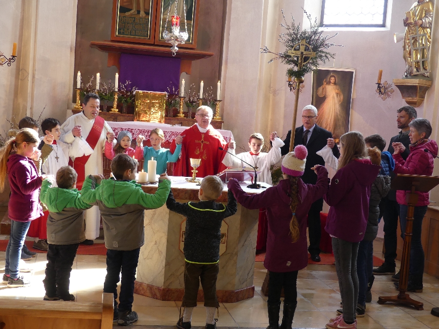Die Kinder begrüßten Jesus in Saaldorf mit dem Kreuzzeichen und dem Mitmachlied „Gott mag Kinder”. In sehr liebevoller Weise brachten beide Teams der Familiengottesdienste den Kindern die Geschichte nahe, was die Kirchengemeinde am Palmsonntag feiert. Sie beschrieben kindgerecht den Einzug Christi auf seinem Esel in die Stadt Jerusalem, wo er laut Überlieferung von seinen „Freunden”, den Jüngern begleitet worden war. Wie die Menschen Jesus bei seinem Einzug als König feierten, ihm mit Zweigen zuwinkten und Kleider auf die Straße legten. Dass er auf einem Esel, ohne Krone und Zepter und ohne prächtiges Schloss kam, dafür aber sehr viel Liebe im Herzen mitbrachte, die Kinder liebte, dass er Kranke heilte und Blinde sehend machte.