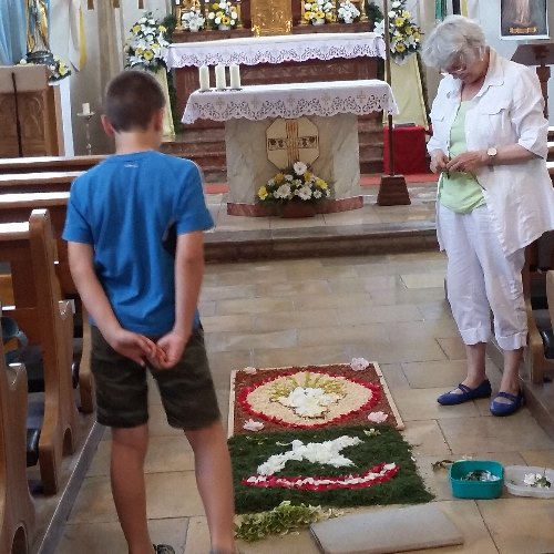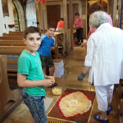 Auch dieses Jahr wurde der Fronleichnamstag von den Christen des Pfarrverbandes am Vortag mit dem Schmücken der Statuen und das Legen des Blütenteppichs begonnen.