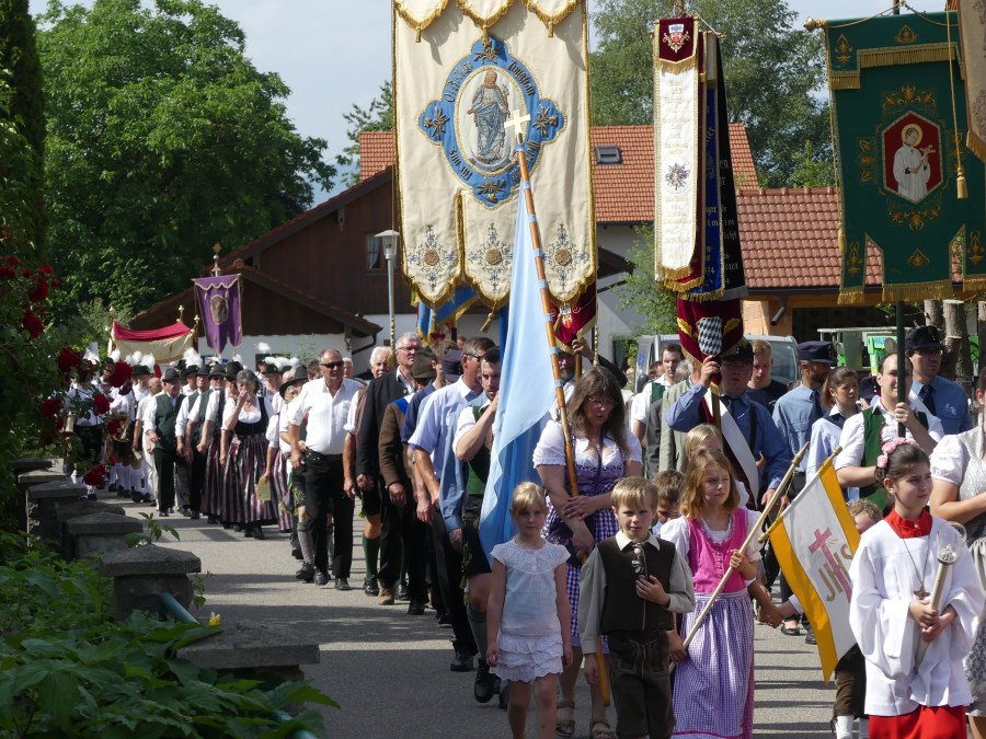 Im Anschluss setzte sich die traditionelle Prozession in Bewegung. Angeführt von den Kirchenfahnen, begleitet von den Ministranten, den Musikkapellen, den Vereinen, dem Kirchenchor, den Kommunionkindern und vielen Gläubigen wurde unter dem Traghimmel die Monstranz mit dem Allerheiligsten in einem feierlichen Zug betend durch das Dorf getragen.