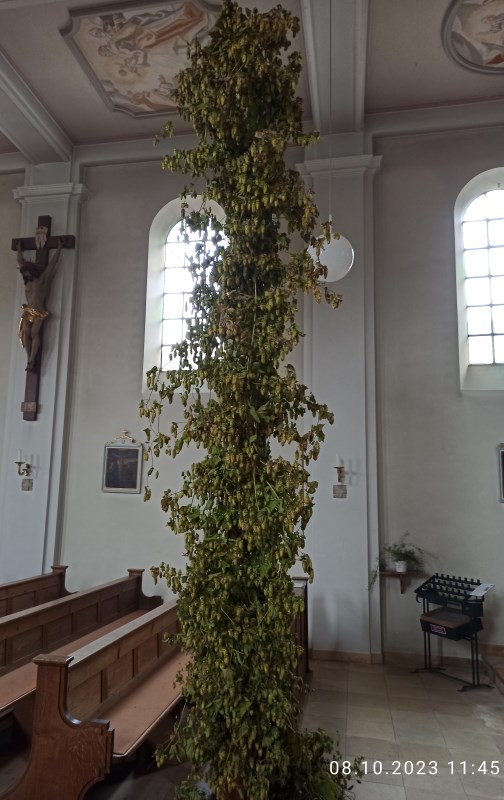 Der Altarraum für Ernte Dank wurde liebevoll von Frau Bergbauer und Frau Kaul gestaltet. Die Hopfenrebe wurde von Familie Schrödl aus Dietersdorf gespendet.