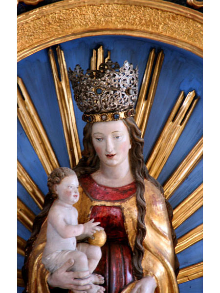 Auf dem linken Seitenaltar steht Maria mit dem Jesuskind.
