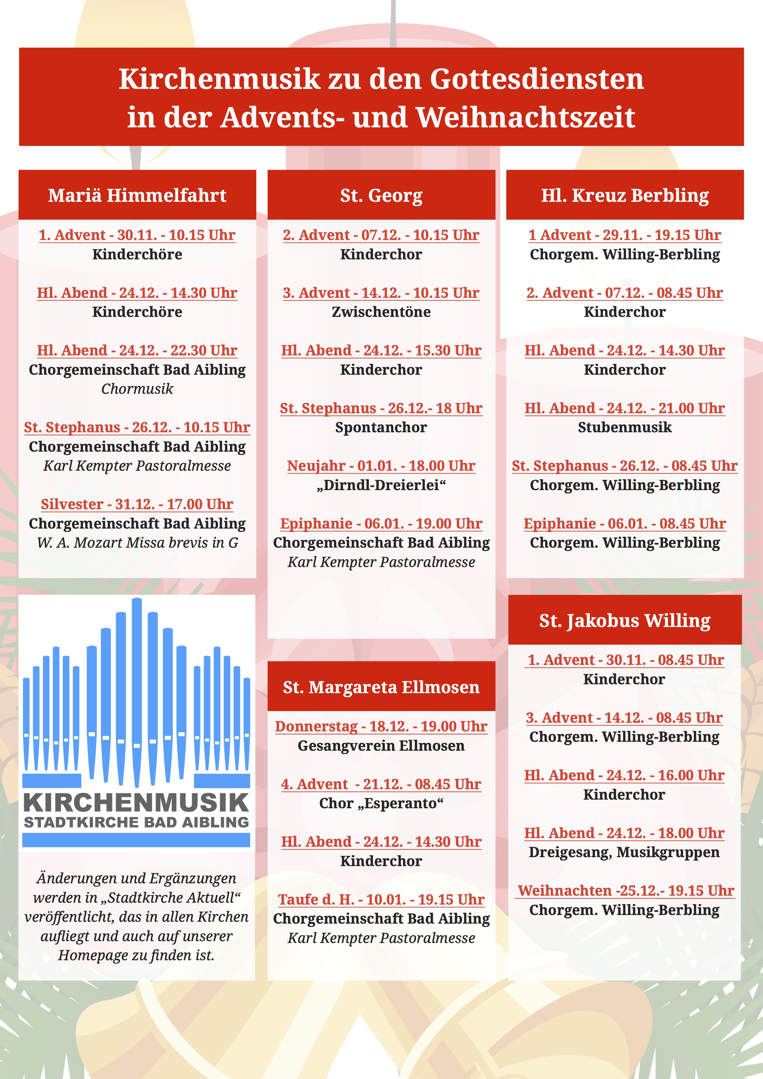 Die Stadtkirche von Bad Aibling mit den vier Pfarreien Maria Himmelfahrt mit der Nebenkirche St. Sebastian, den Filialen St. Margaretha Ellmosen, St. Vitus Mie-