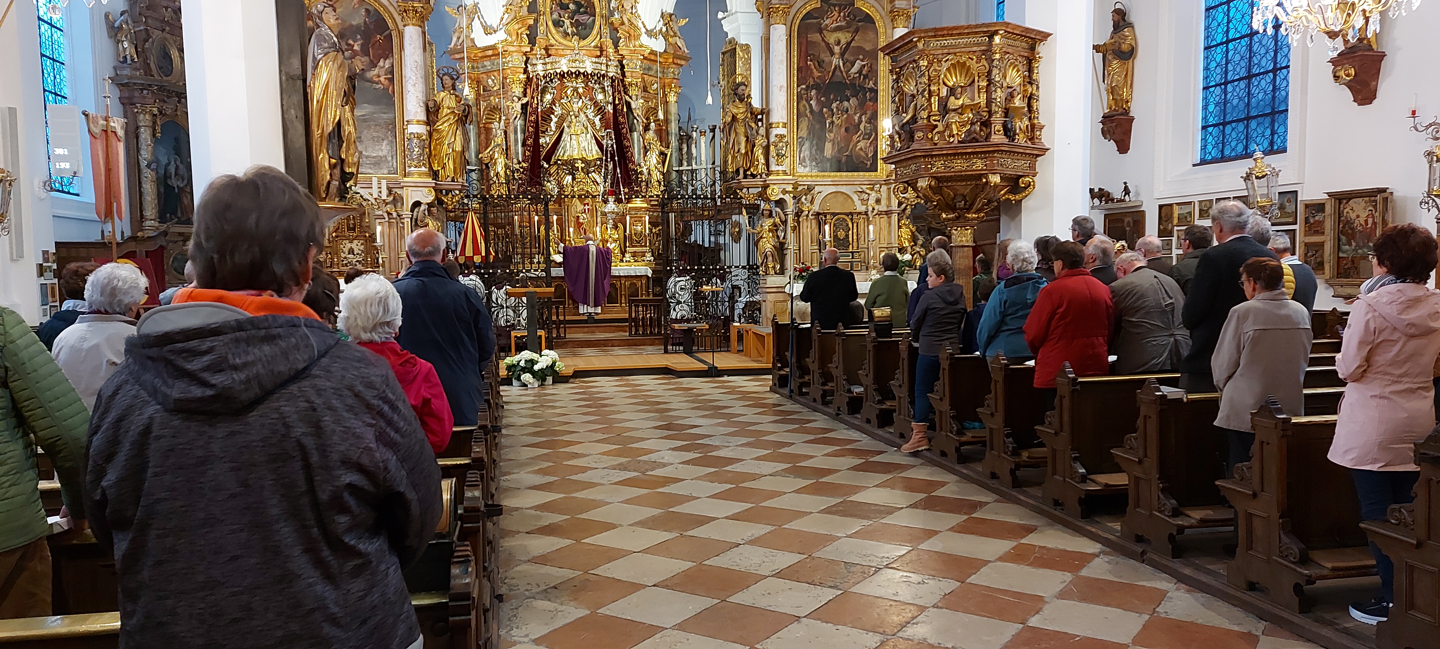 treibung, Energiekrise, steigende Preise, Zerstörung der Umwelt) und Liebe (im Sehen, Verstehen, Helfen). Mit festlichem Glockengeläut wurde unsere große Gruppe begrüßt, Die herrliche Wallfahrtskirche war festlich geschmückt, viele Kerzen brannten, die Sonnenstrahlen an diesem Nachmittag durchfluteten diesen schönen Raum. Pfarrer Wittig von der dortigen Gemeinde (bekannt auch durch die sonntäglichen Gottesdienstübertragungen im RFO) begrüßte uns und erzählte uns einiges über die Kirche und die dortige sehr alte Wallfahrt. Dann sangen wir mit Diakon Bernd Schmitz zwei Marienlieder und feierten ein Marienlob aus dem Gotteslob. Danach kehrten wir in Engelberg ein, aßen und tranken, feierten unser Zusammensein. Mit vielen schönen Eindrücken kehrten wir wohlbehalten nach Bad Aibling zurück.