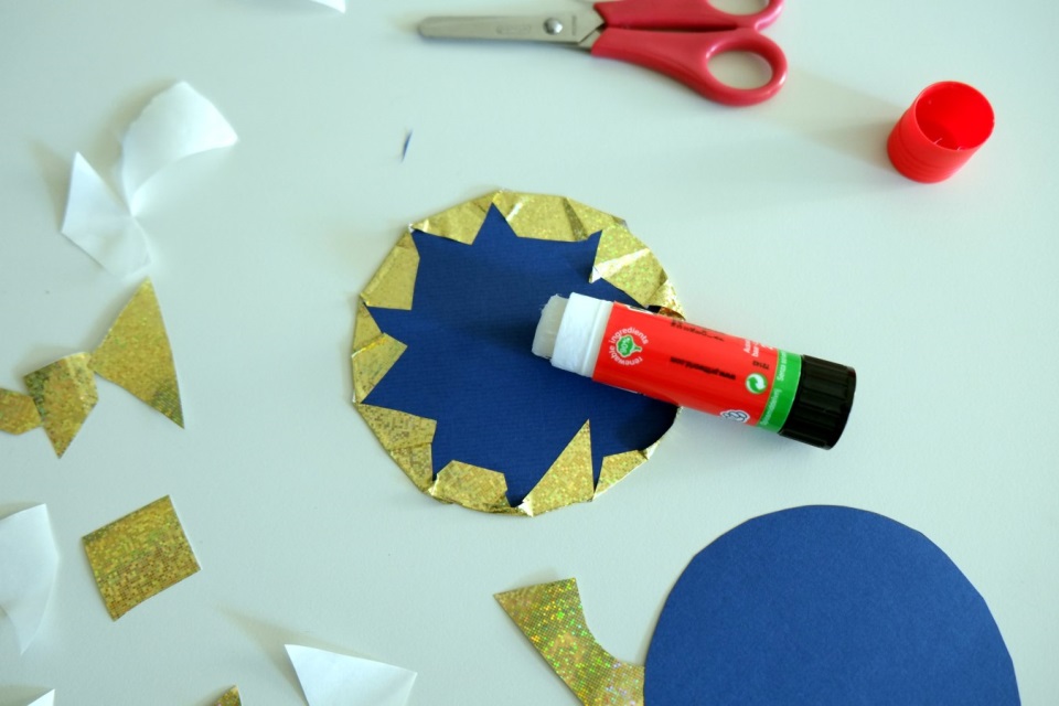 Dazu streichst Du mit dem Klebestift die Rückseite ein - besonders auch den Goldrand - und legst die zweite Tonpapierscheibe drauf. Beide Seite fest aufeinanderdrücken.