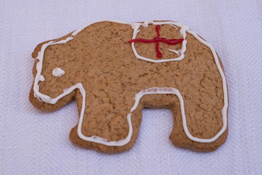 7. Entweder fertige Glasur besorgen oder Eiweißglasur selbst herstellen, in Tüte füllen, kleine Ecklöcher einschneiden, das Gepäck aufmalen sowie Augen und Schnauze.