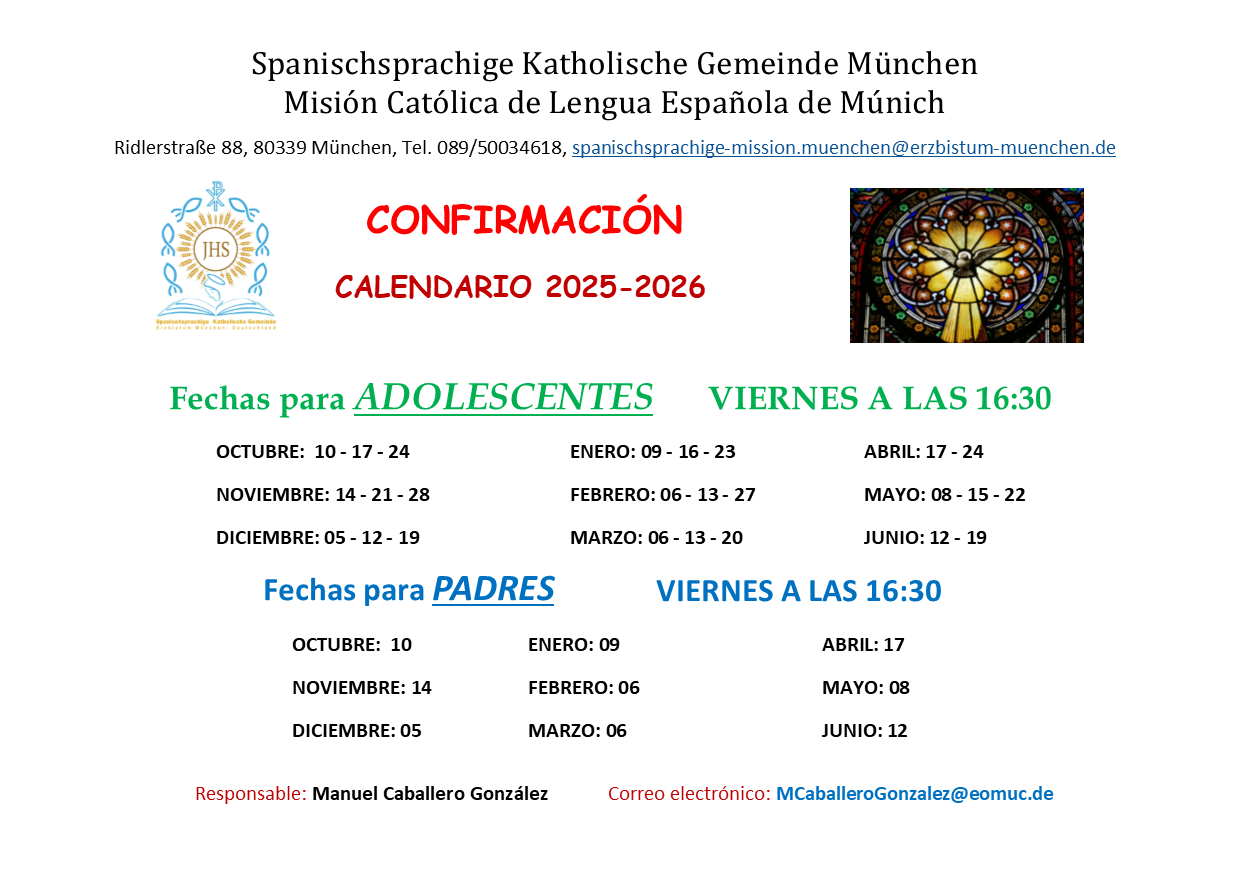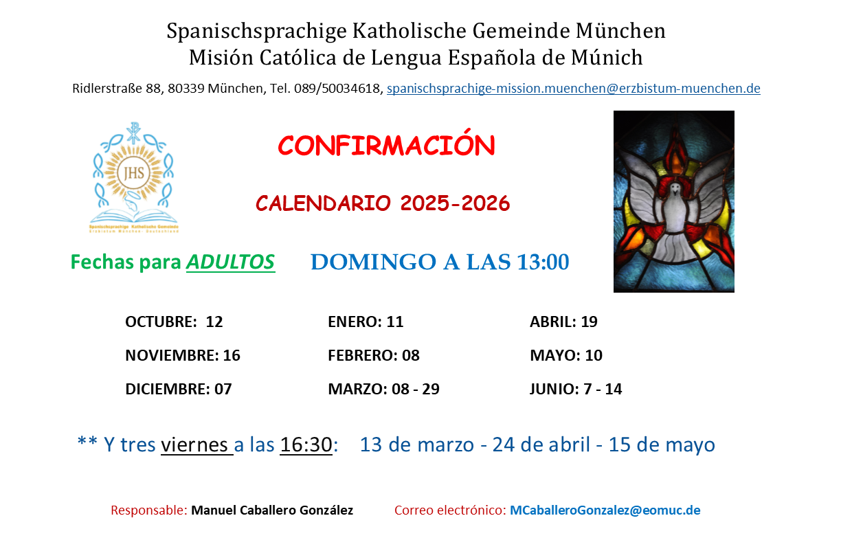Pónganse en contacto la secretaría de la Misión por teléfono 089 50034618 o por email: spanischsprachige-mission.muenchen@erzbistum-muenchen.de