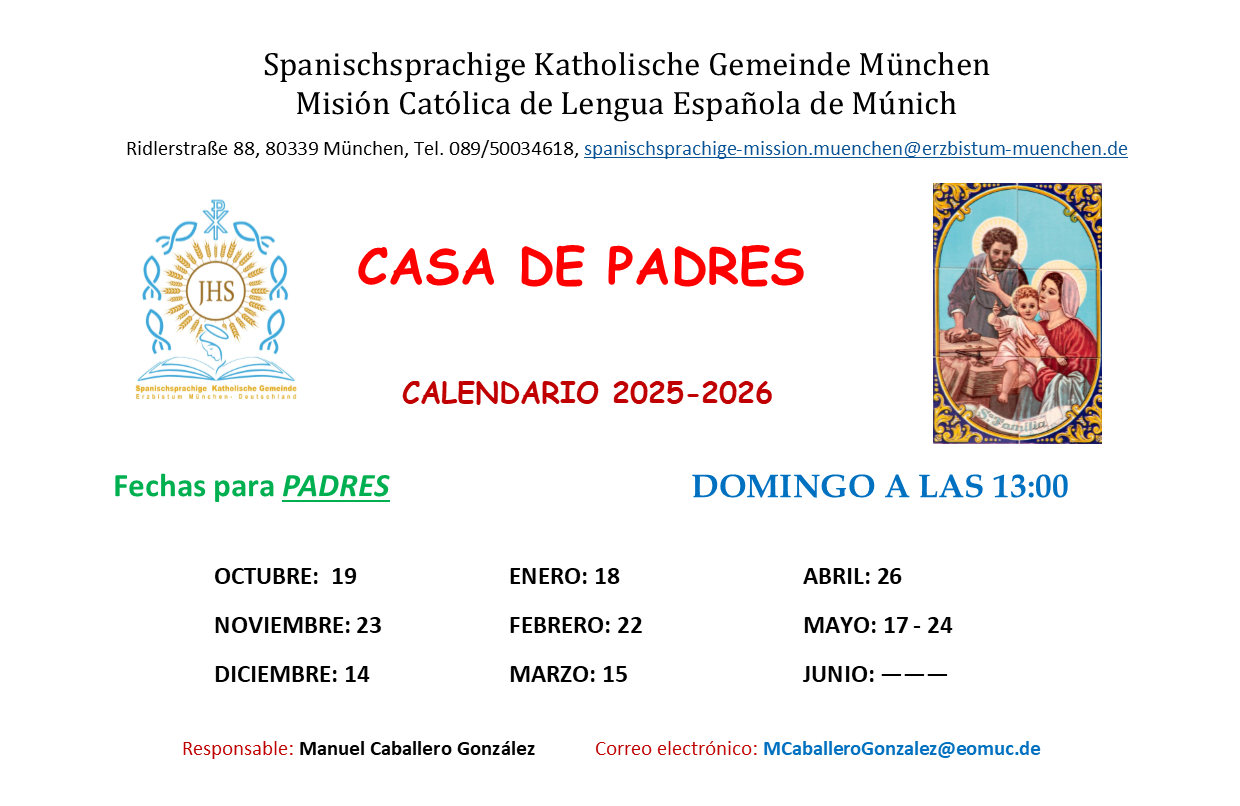 Para auxiliar a los padres en esta noble misión proponemos a todos los padres de la Misión (y a quien ha descubierto su vocación paterna en el alma) a la catequesis llamada ‘Casa de Padres’; tendrá lugar una vez al mes de 13:00 a 14:00 en la Misión Católica de Lengua Española. En concreto, el calendario para este año pastoral se puede descargar pulsando aquí.