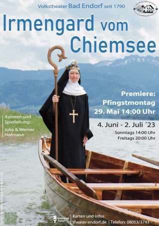 Rund 50 Schauspieler werden, unterstützt vom Bläserkreis Halfing, das Leben der seligen Irmengard vom Chiemsee auf die Bühne des Volkstheaters in Bad Endorf bringen. Die Musik für das Stück wurde eigens komponiert. Weihbischof Rupert Graf zu Stolberg wird zum Pfingstmontagsgottesdienst und der anschließenden Premiere erwartet.